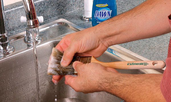 Use hot h2o and dish lather to remove h2o-based finishes from brushes. Lather, rinse, and repeat two or three times.